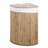 Cesto porta biancheria con struttura in bambù di colore naturale, composto da listelli di bambù tenuti insieme da un nastro di tessuto. Il cesto è dotato di due maniglie in corda ed è foderato con un tessuto di colore bianco. Il porta biancheria è dotato anche di un coperchio in bambù con una maniglia in corda.