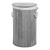 Cesto porta biancheria con struttura in bambù di colore grigio, composto da listelli di bambù tenuti insieme da un nastro di tessuto. Il cesto è dotato di due maniglie in corda ed è foderato con un tessuto di colore bianco. Il porta biancheria è dotato anche di un coperchio in bambù con una maniglia in corda.