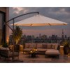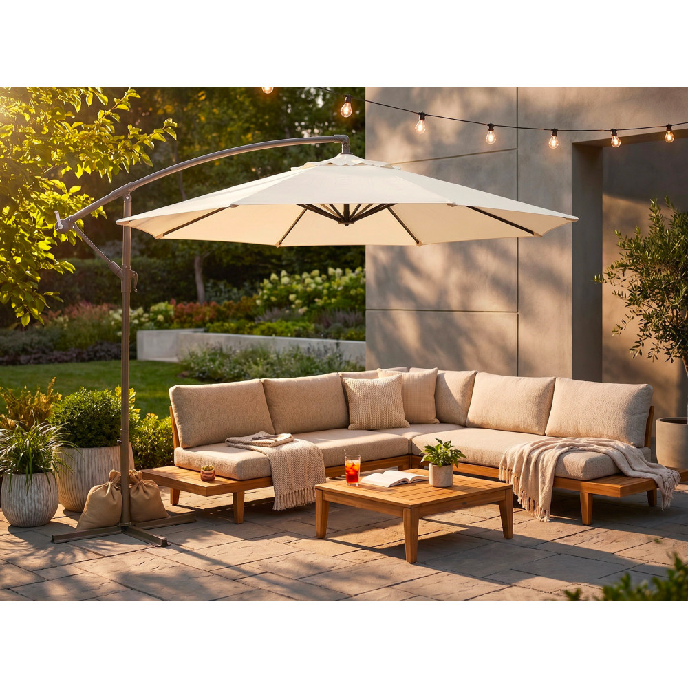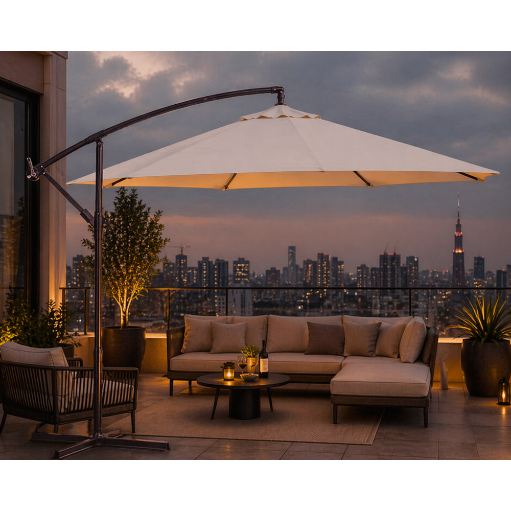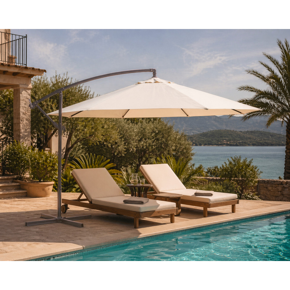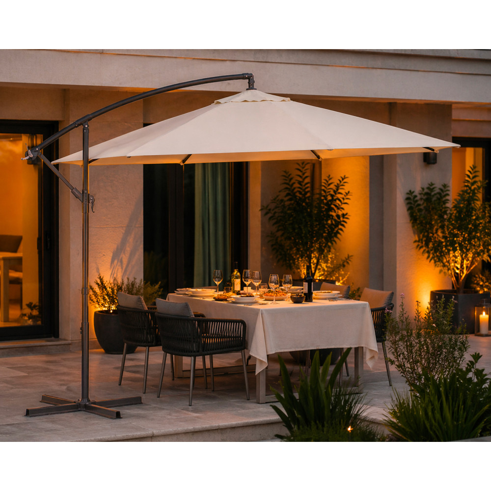 Ombrellone rotondo a braccio con struttura in acciaio, palo a sezione tonda Ø 48 - 42 mm, 6 stecche in acciaio, copertura in poliestere da 160 gr/mq. Base di appoggio a crocera. Disponibile in tre varianti colore. Dimensione: Ø 300 cm