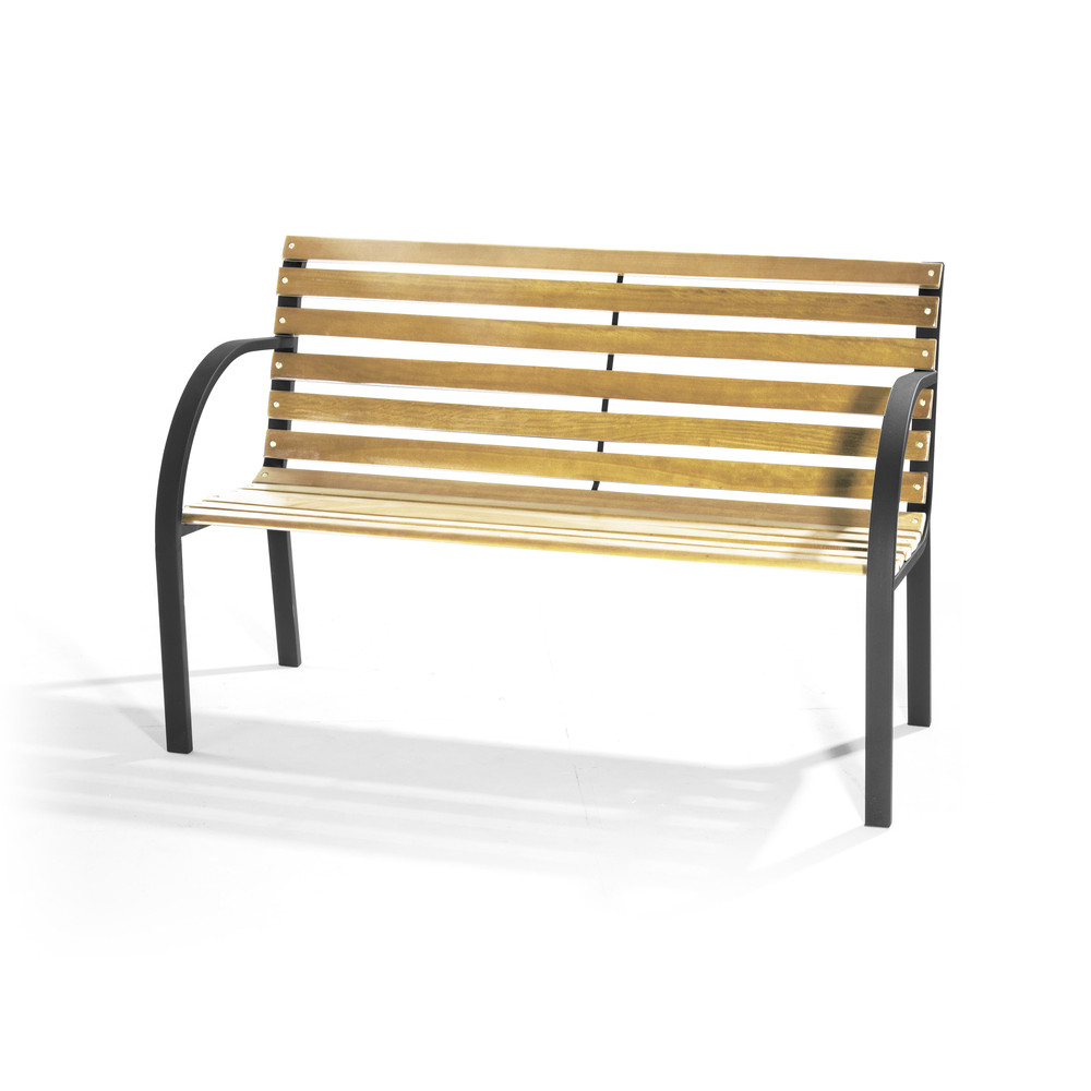 Panchina 2 posti, realizzata con struttura in tubolare di metallo verniciato e doghe, semplice e robusta. Ideale per un portico o in giardino. Struttura nera doghe legno naturale. Dimensione: cm 120x62 H. 82