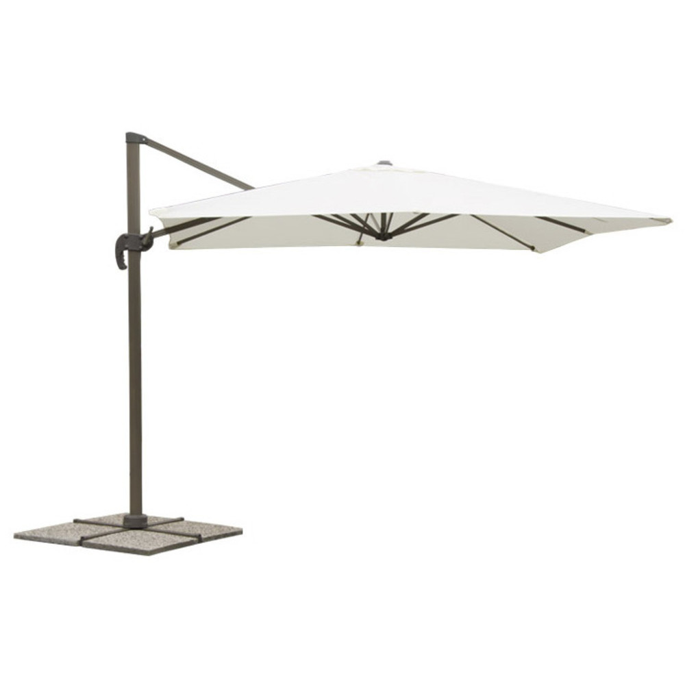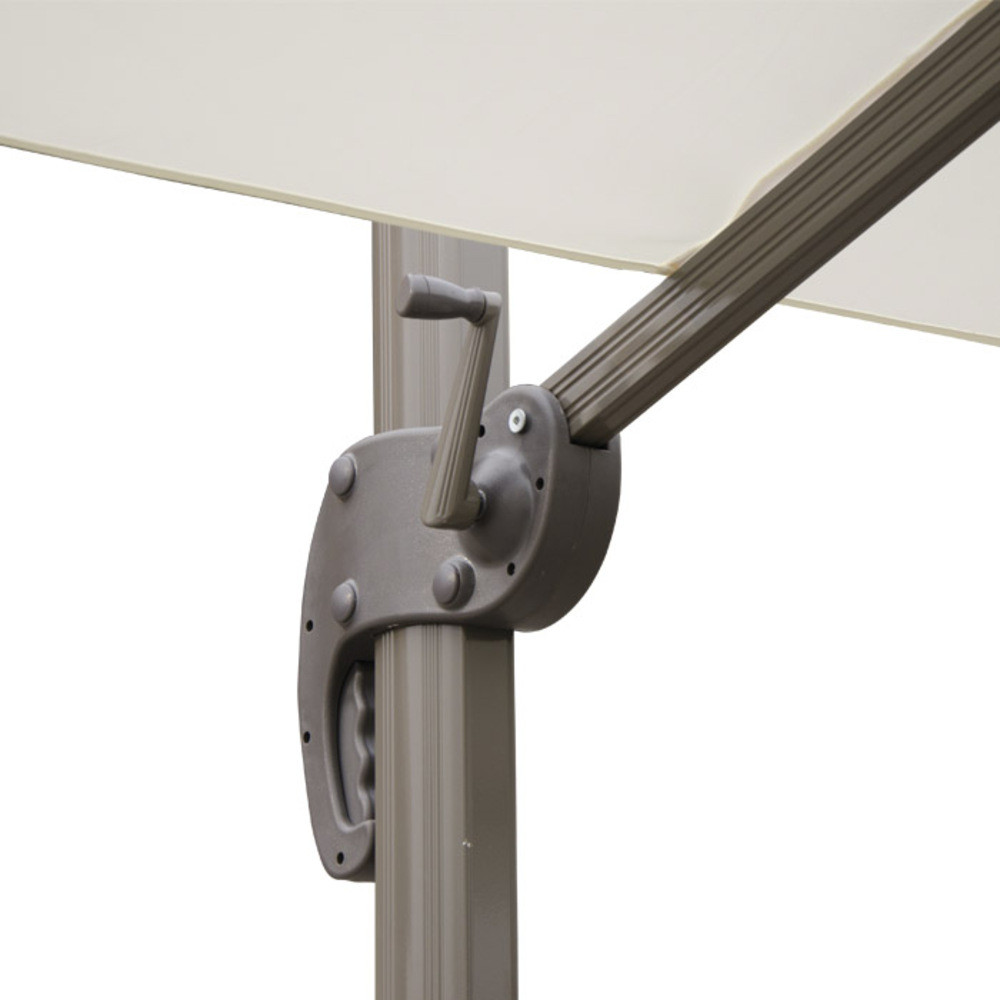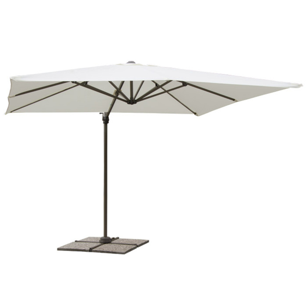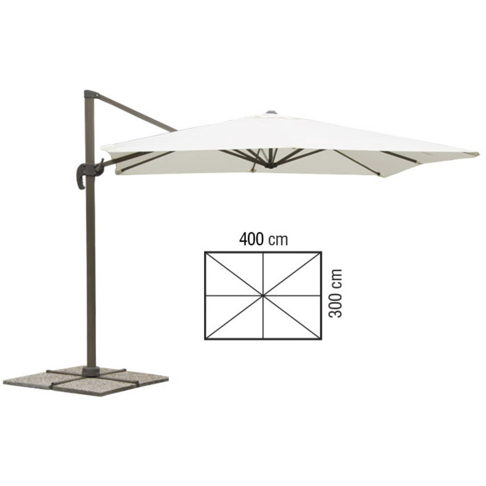 Ombrellone a braccio 3x4m, reclinabile con struttura in alluminio e copertura in poliestere da 280 gr/mq color écru impermeabilizzato. Dispone di 8 stecche, cuspide antivento e rotazione di 360°. Vista la dimensione e il peso notevole dell'ombrellone, si raccomanda l'uso di piastre di cemento per il basamento a croce. Confezione: scatola in cartone.